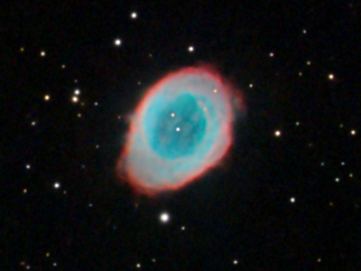 The Ring Nebula (also catalogued as Messier 57, M 57 or NGC 6720) is a planetary nebula in the northern constellation of Lyra. Such objects are formed when a shell of ionized gas is expelled into the surrounding interstellar medium by a star in the last stages of its evolution before becoming a white dwarf. It has a apparent magnitude of 8.8 while the whole disk has the size of 1.5' x 1' (arcminutes). Below you can find a cropped and zoomed image.
