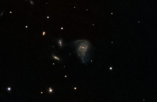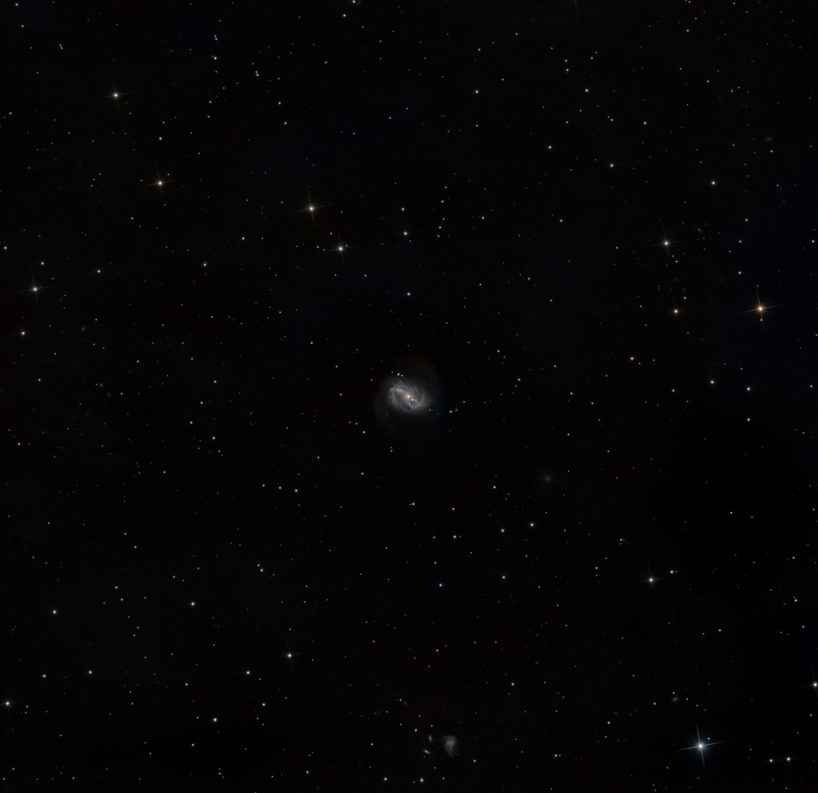 NGC 6217 is a barred spiral galaxy located some 67 million light years away, in the constellation Ursa Minor. A morphological classification of (R') SB(rs) indicates that NGC 6217 has a false outer ring-like structure formed from the spiral arms (R'), a well-defined bar running across the nucleus (SB), a partial inner ring (rs), and moderately-wound spiral arms (bc) as shown in the photo. There is also a small galaxy group in the bottom of the frame, containing galaxies PGC214523, PGC214524 and the larger one PGC58619. Below you can see an enlarged version of that very faint and far galaxy group
